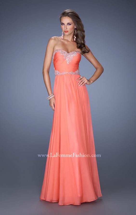 Lovely sweetheart chiffon gown with a fitted waist and bodice. The top is adorned with a vintage inspired rhinestone and jewel design. Back zipper closure.