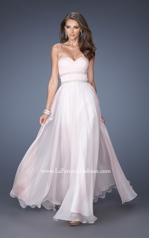 Elegant chiffon gown with a strapless pleated bodice. Waist is accentuated with two beaded and rhinestone belts. Back zipper closure.