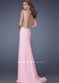 V-neck jersey gown with sheer net sleeves and side cutouts. Net is covered with iridescent stones and jewels. Skirt has a side slit and a small train. Back is a sheer with a keyhole cut out. Back zipper closure.
