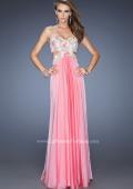 Pretty chiffon gown with a sweetheart neckline and cut-outs at the waist. The bodice and waistband are adorned with jeweled multi-colored lace. Back zipper closure.