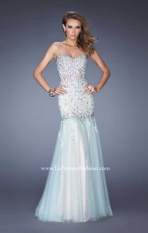 Strapless gown with a nude lining and colored tulle overlay. Bodice is adorned with iridescent jewels and stones that cascade down to the skirt. Back zipper closure.