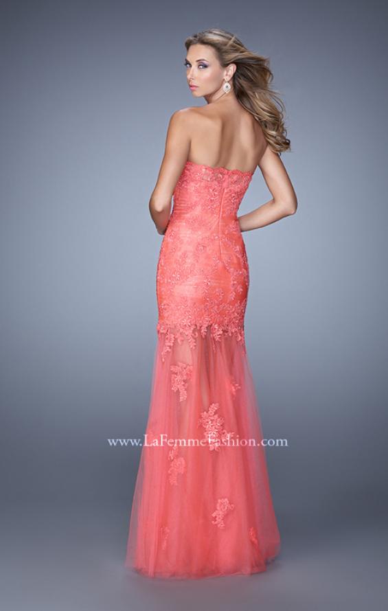 Stunning form fitted dress with sheer tulle skirt. The dress has a sweetheart neckline. The bodice and skirt are lightly accented with lace appliques. Back zipper closure.