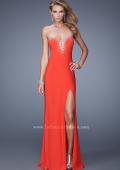 Beautiful jersey dress with a sweetheart neckline and sheer inset. The bust line and sheer back strap are embellished with scattered rhinestones. Back zipper closure.