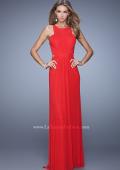 Enchanting net jersey dress with ruched overlay and high scoop neckline. The straps connect in back with covered buttons and create diamond shaped cut out. Back zipper closure.