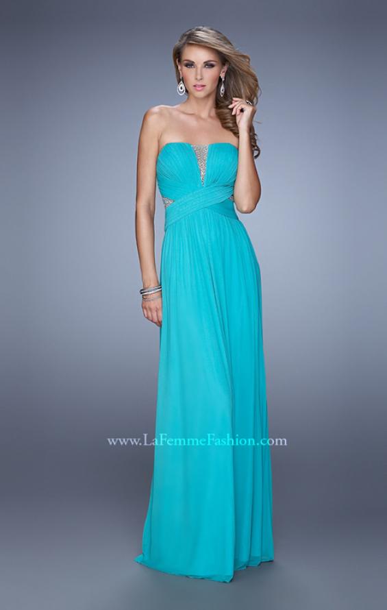 Stunning net jersey dress with a modified sweetheart neckline and gathered bodice. The plunging "V" neckline, sides and back are sheer accented with iridescent stones. Side zipper closure.