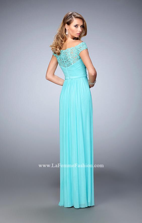 Elegant off the shoulder net gown with a gathered bodice and skirt. The shoulders are embellished with lace applique and intricately placed rhinestones. Back zipper closure.