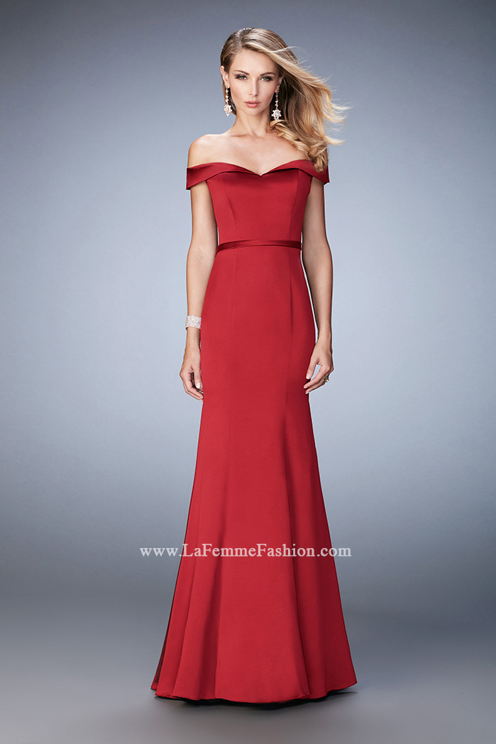 Sophisticated stretch satin mermaid gown with sweetheart neckline and off the shoulder straps. Back zipper closure.