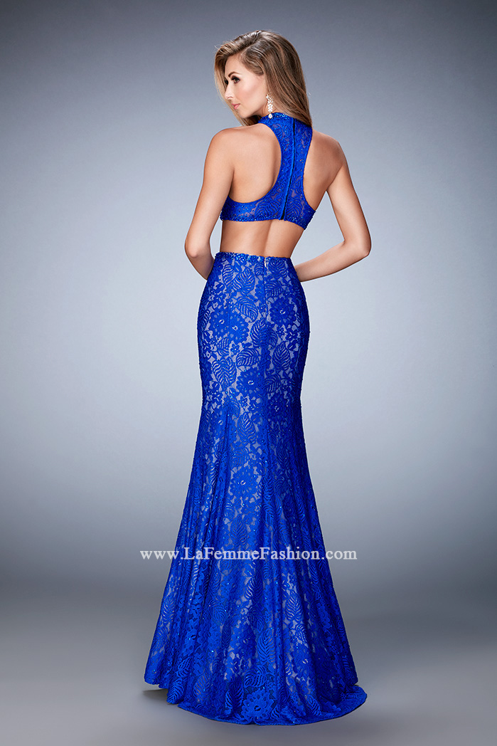 Glamorous two piece lace gown with racer style black and nude lining. The gown is embellished with scattered stones. Back zipper closures.