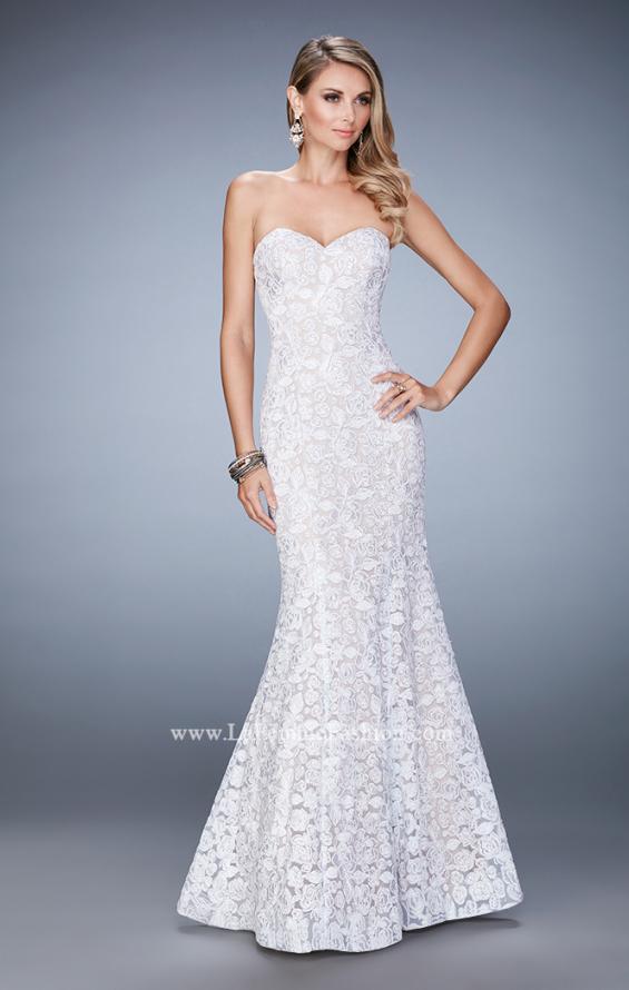 Elegant lace mermaid gown with a sweetheart neckline. The gown features a contrast nude lining and back zipper closure.