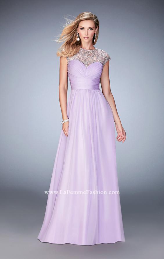 Graceful chiffon gown with an illusion neckline and back. The bodice is embellished with crystals and beads. Back zipper closure.