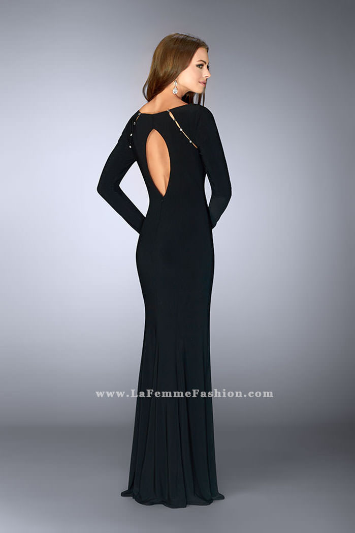 Exquisite jersey gown with small cutouts along the shoulders and double slits. Each cut out is fastened with a rhinestone. This dress features an open back. Back zipper closure.