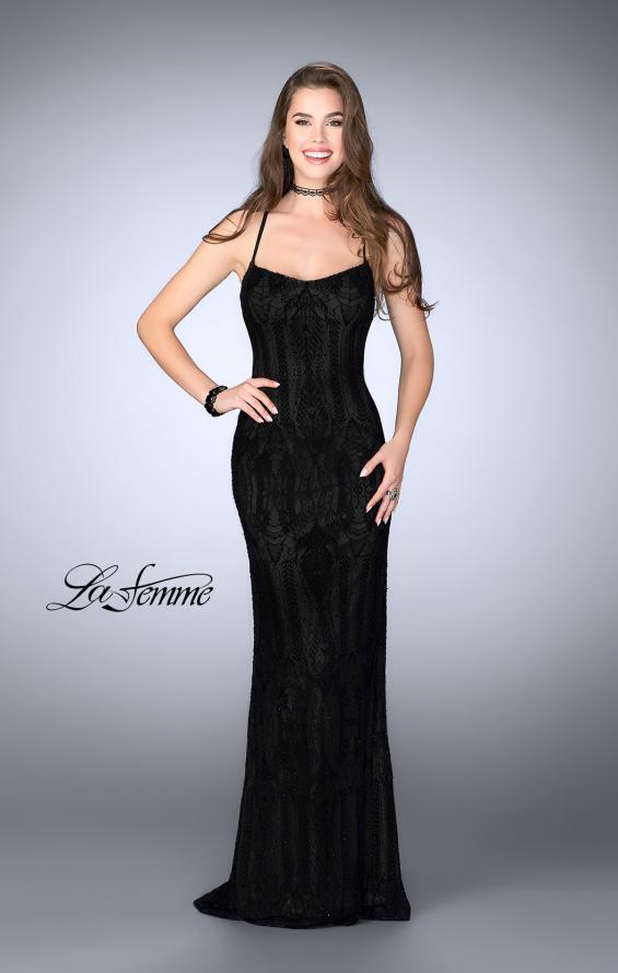 Edgy fitted dress with a modern lace pattern that is embellished with matching rhinestones. Features black lining and an open strappy back. Back zipper closure.