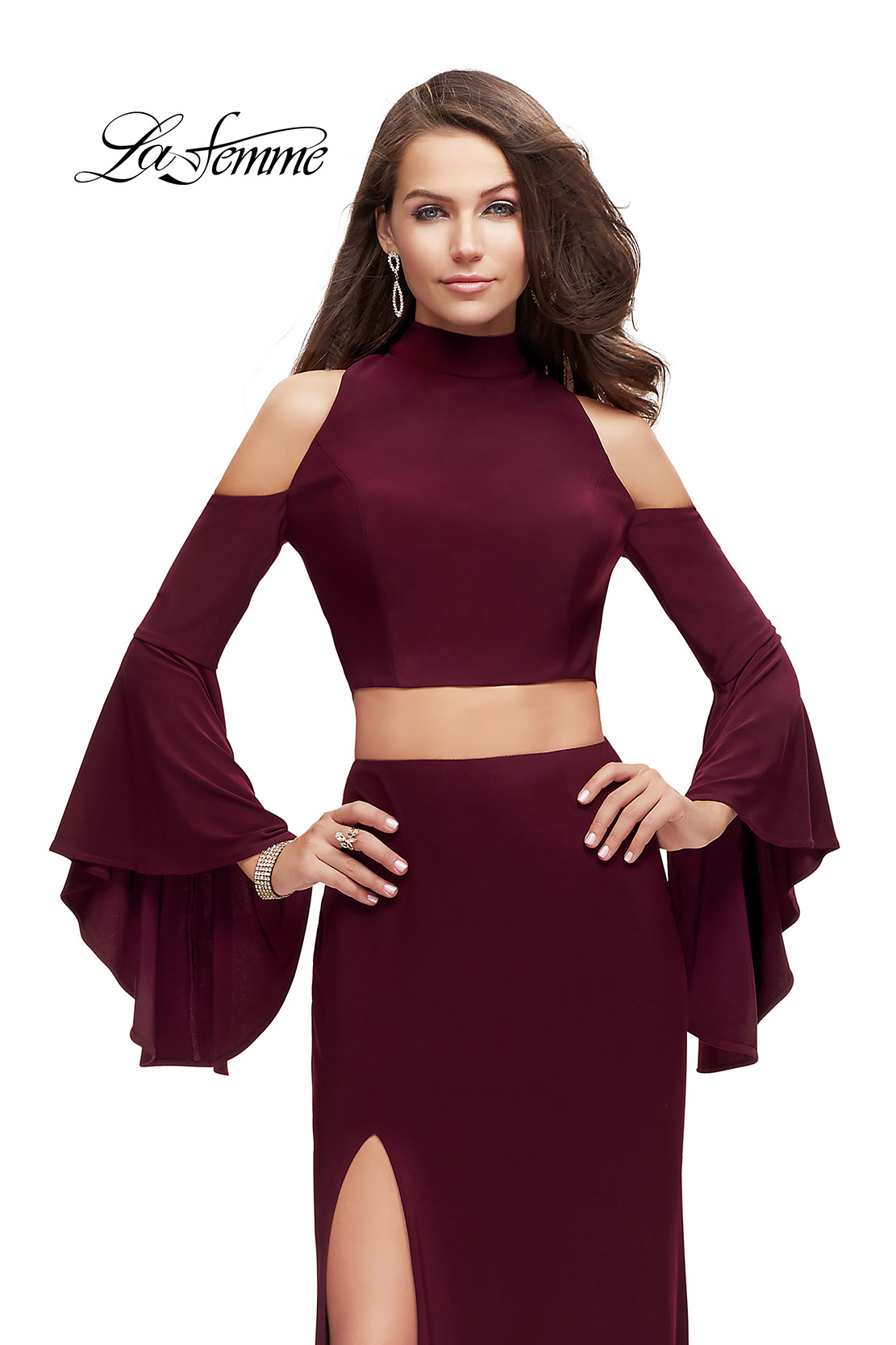 Chic two piece jersey dress with a high collar neckline. Features cold shoulder Cutouts and flared bell sleeves. Back zipper closure.