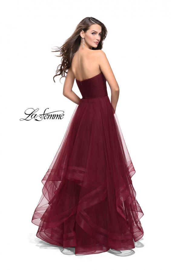 Timeless cascading tulle ball gown. Featuring a criss cross sweetheart neckline and textured bodice. Back zipper closure.