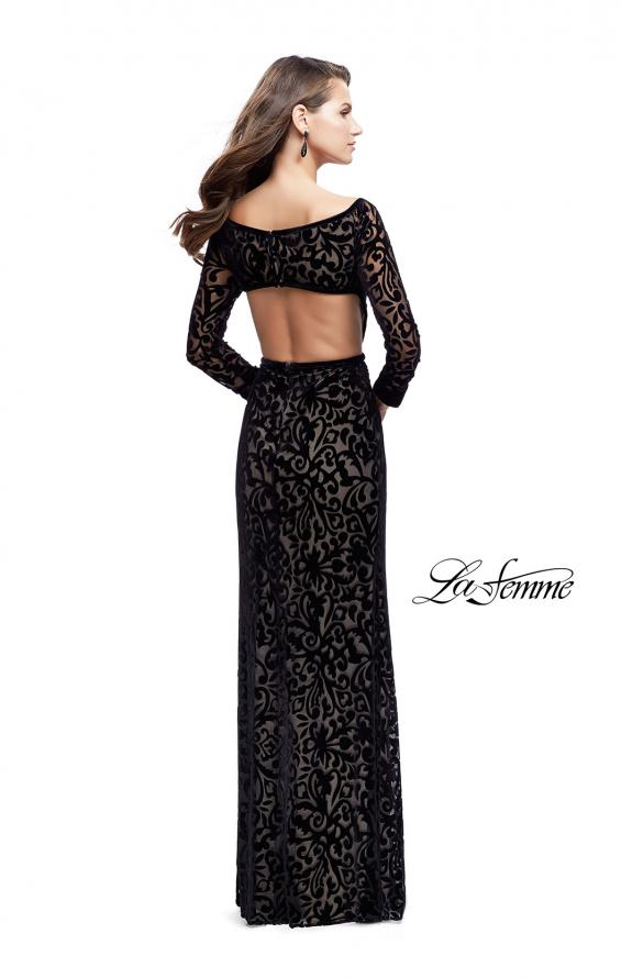 Captivating long sleeve velvet patterned dress with a deep V neckline. Features a sexy open back. Back zipper closure.