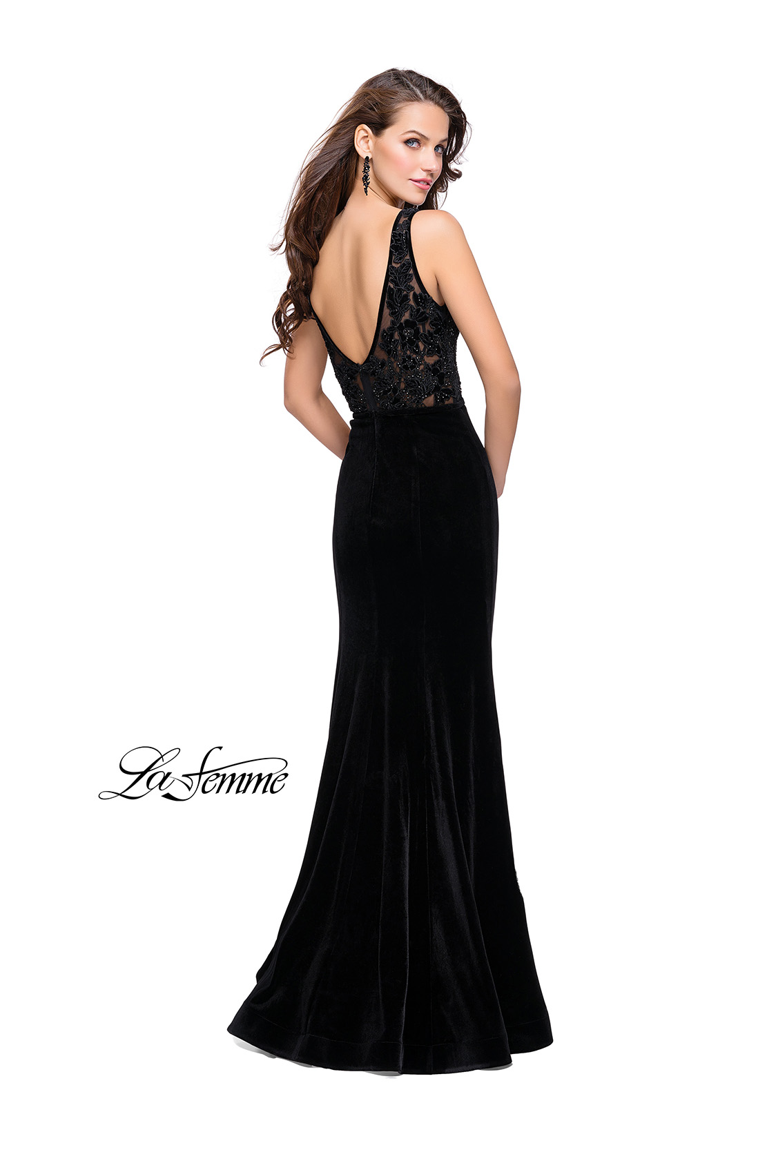 Alluring velvet gown with a deep V neckline. Featuring an embellished velvet lace bodice and a low V open back. Back zipper closure.