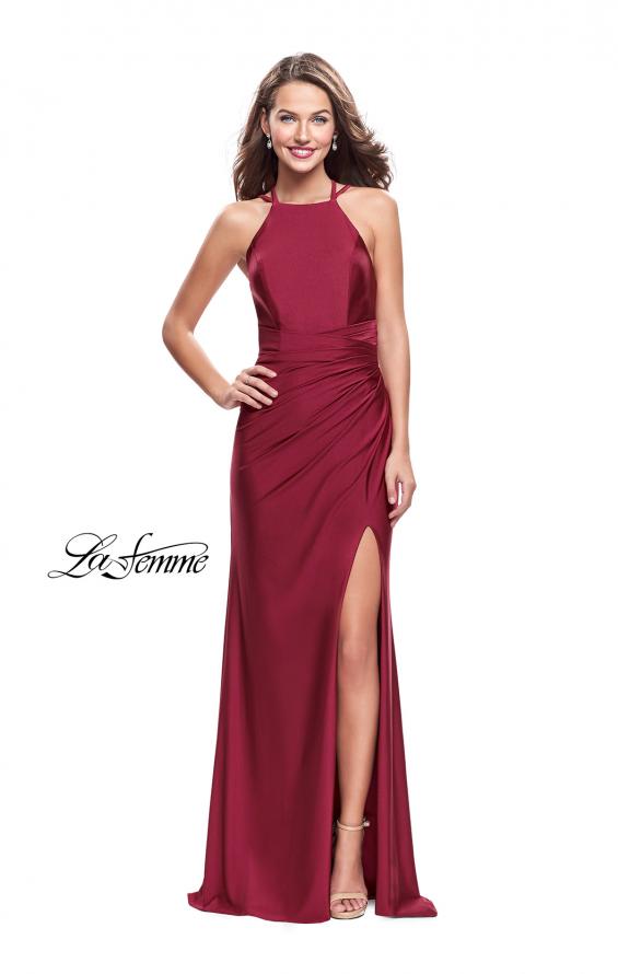Classic high neck form-fitting gown with side ruching. Featuring a side leg slit and a strappy open back. Back zipper closure.