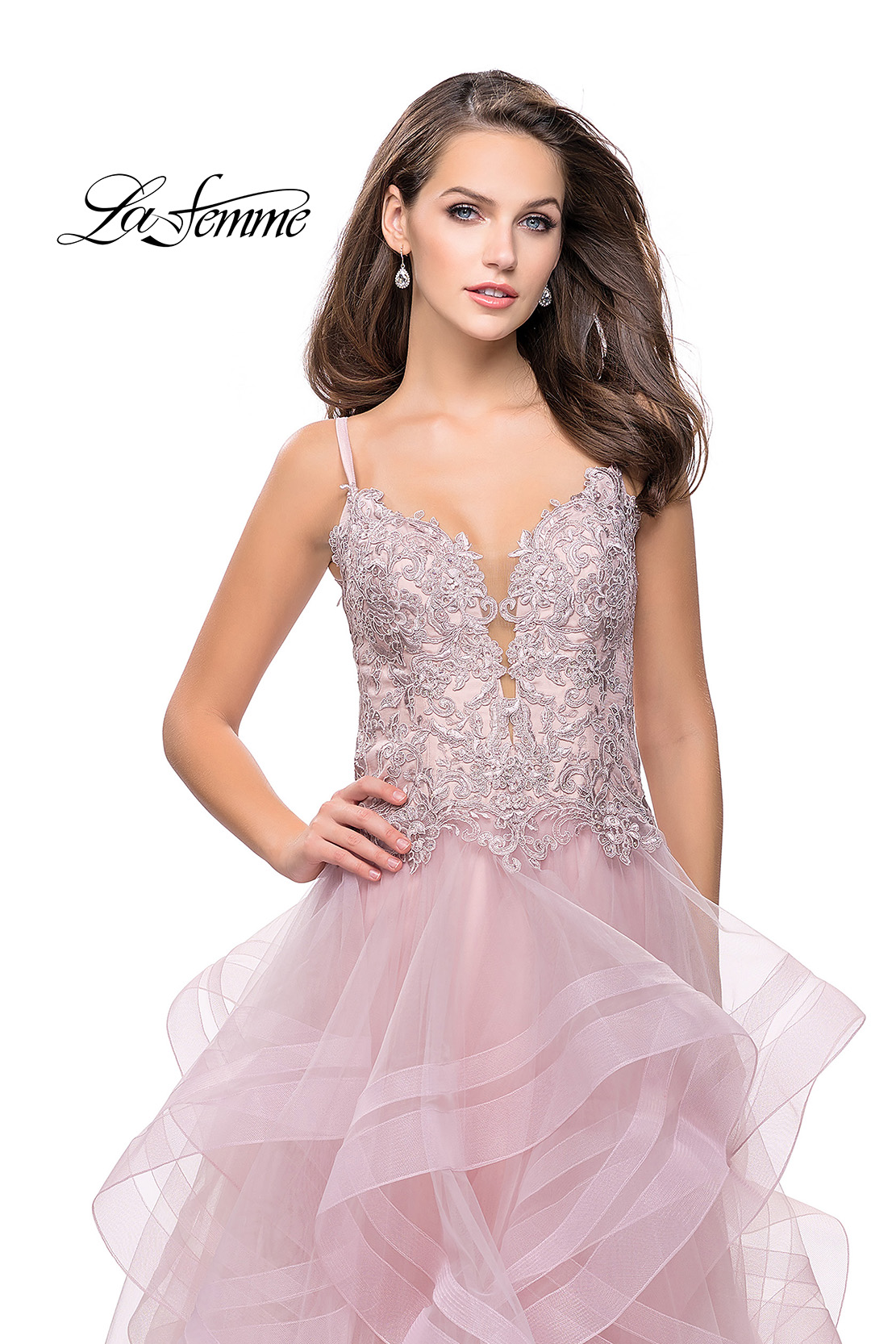 Enchanting ball gown with a cascading tulle skirt and a beaded lace bodice. Features a V neckline and diamond open back. Back zipper closure.