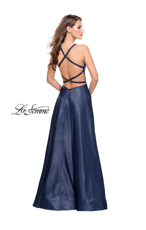Elegant mikado A-line dress with a high neck and beaded strap details. Featuring pockets and a beaded strappy open back. Back zipper closure.