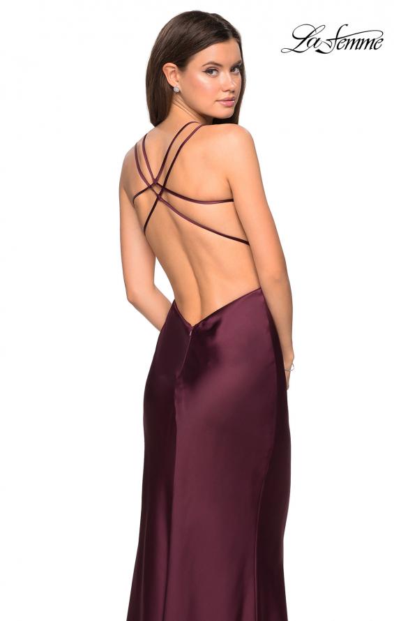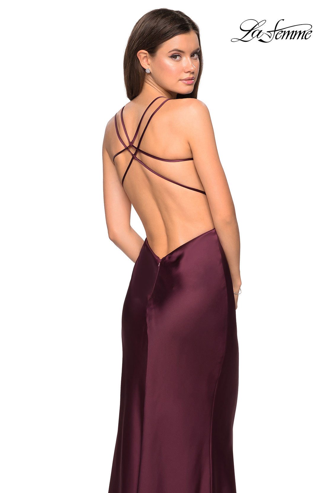 Sleek satin floor length prom gown with small scoop neckline. Dress features a left side leg slit and open strappy back. Back zipper closure.