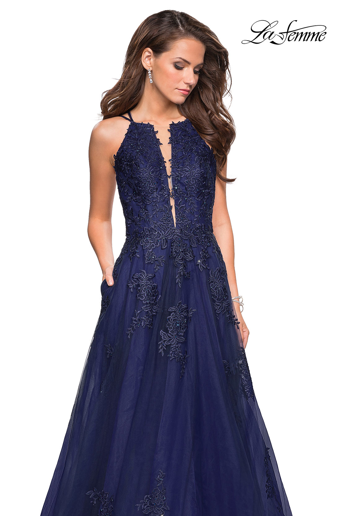 Unique A-line long gown with cascading lace detail. The tulle skirt gives this dress a whimsical feel. A high neckline and strappy back complete the look. Back zipper closure.