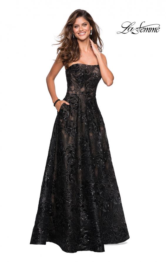 Steal the spotlight in this black floor length strapless A-line gown. The lace fabric is adorned with sequin detail and pockets complete the look. Back zipper closure.