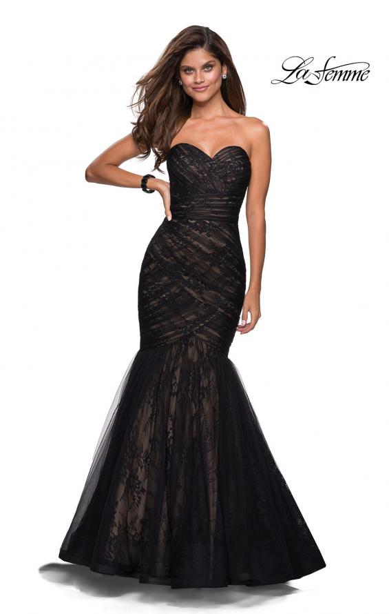 Floor length mermaid style gown with strapless sweetheart neckline. Features a lace underlay and ruching down the dress. Back zipper closure.
