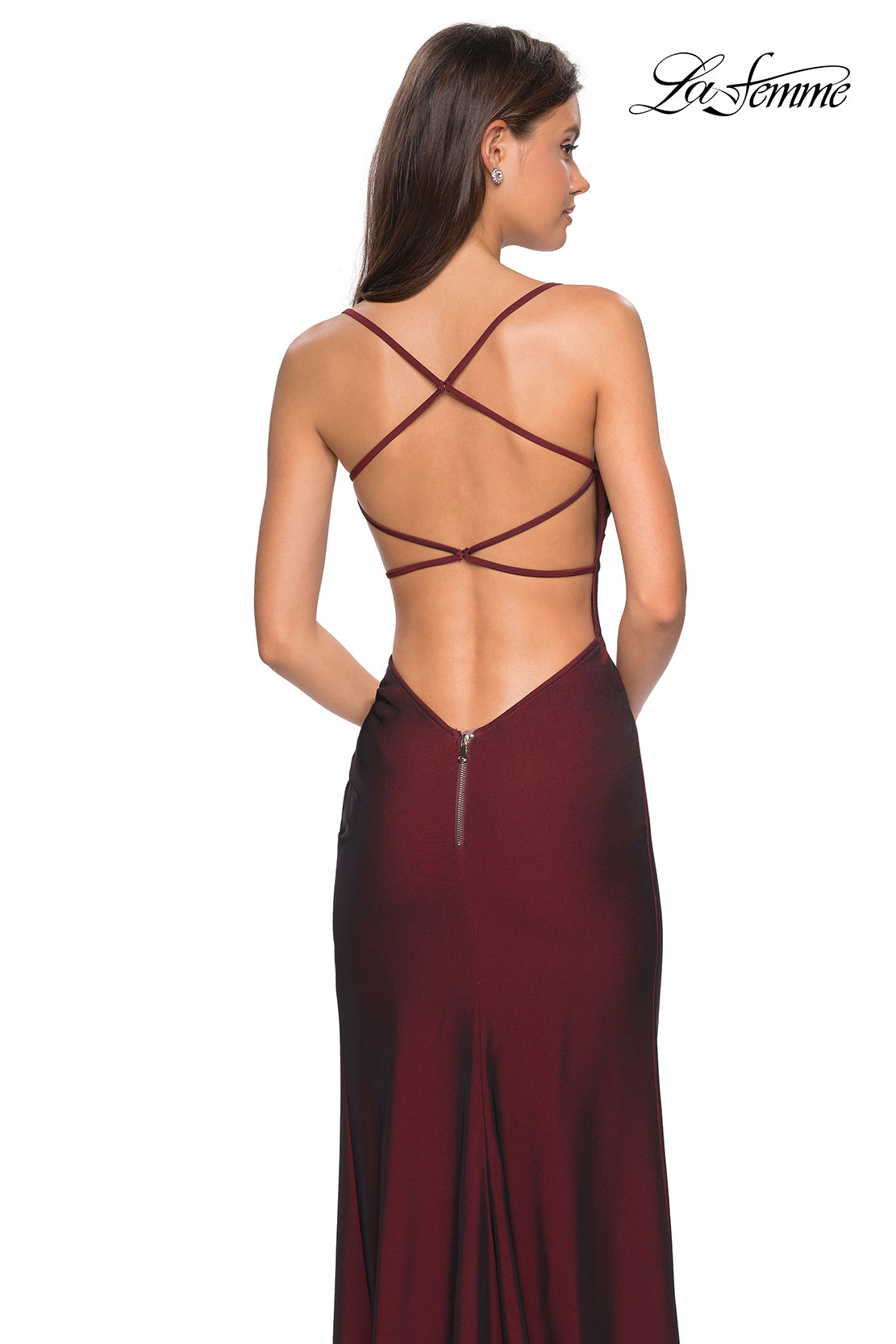 Figure flattering jersey prom dress. Features a left side leg slit and intricate strappy back. Back zipper closure.