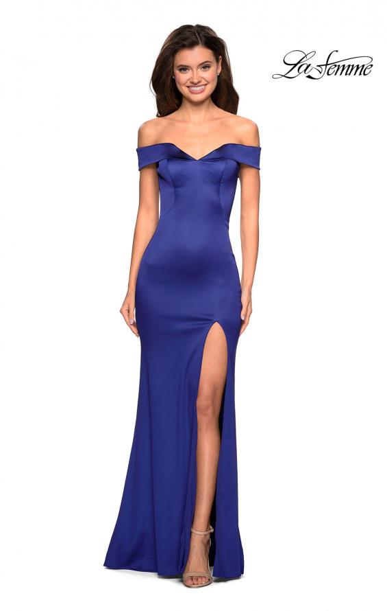 Form fitting chic stretch satin dress that is perfect for any occasion. This off the shoulder design includes a left side leg slit and gold exposed back zipper closure.