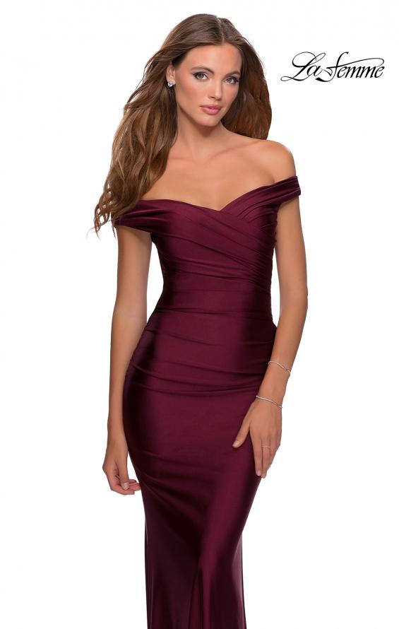 Elegant long prom dress with ruching for a flattering effect. Features an pleated off the shoulder sweetheart bodice. Back zipper closure. Dress also comes in dark emerald under number 30631.