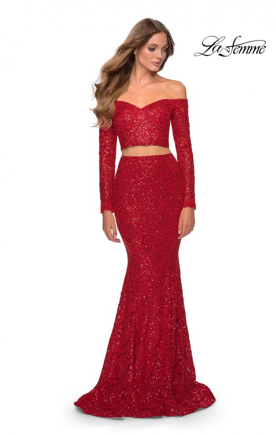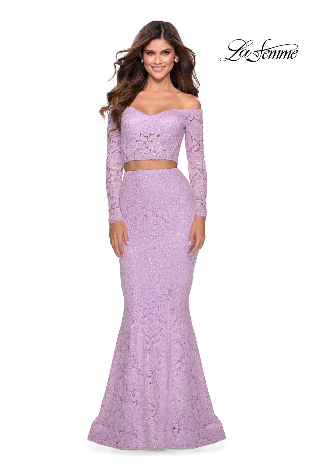 Trendy two piece sequin lace prom dress with long sleeves and off the shoulder detailing. A sheer full zip back completes the look. Back zipper closure.