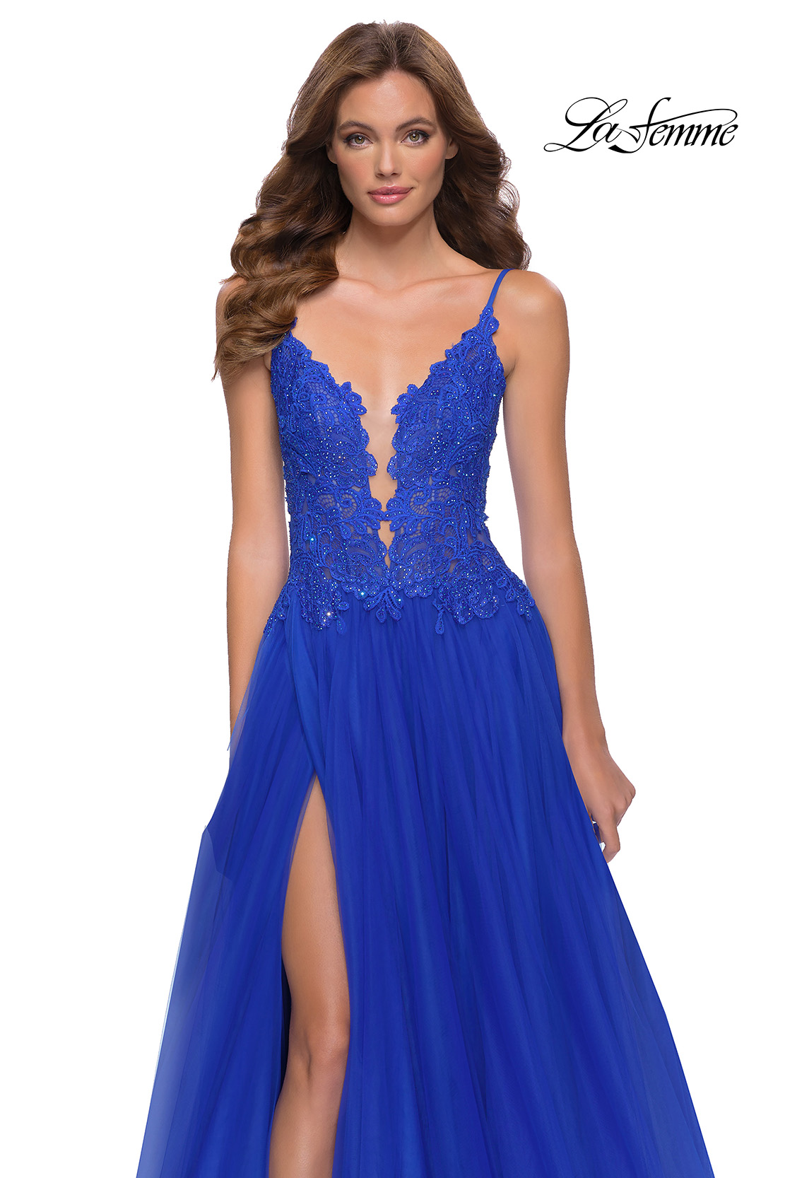 A line tulle gown with slit and lace bodice. Bodice features sheer illusion net covered in lace applique. Low V back and deep illusion V front. Back zipper closure. Dress comes in neon pink under number 29964. Dress comes in dark emerald, dusty mauve and red under number 31507.