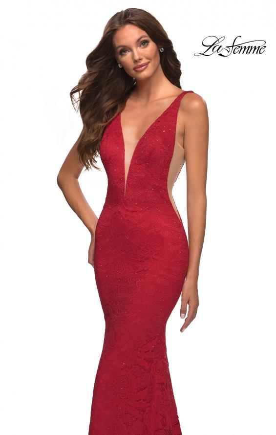 Simple stretch lace gown with deep V mesh neckline. V back and flattering seams across waist. Back zipper closure. Dress comes in neon pink under number 30677.
