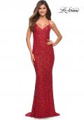 Luxurious soft stretch sequin gown with V neckline and low open back. Hook and eye top strap. Back zipper closure.
