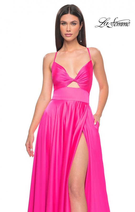 A-line satin prom dress with high slit and cut out below the bust. Banded waist and twist detail on the bust. Open lace up back. Back zipper closure. Dress comes in red and royal blue under number 31193.