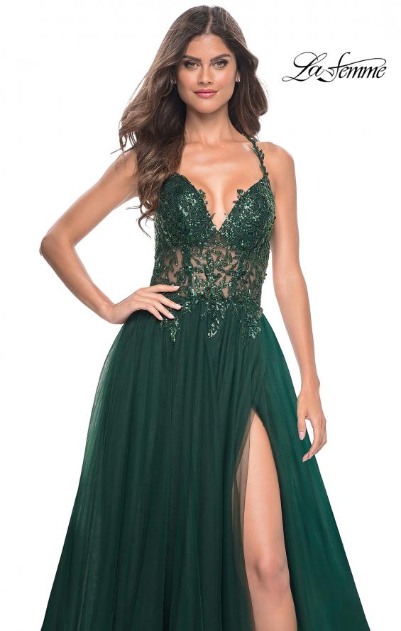 A-line tulle gown with high slit and open back. The bodice features a sheer waist and beaded lace applique throughout. Back zipper closure. Dress comes in light periwinkle and sage under number 31369.