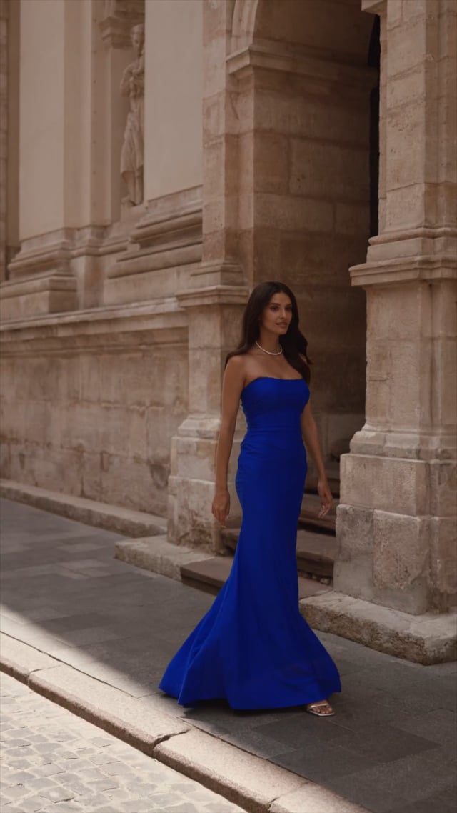 Chic evening jersey dress with ruching and crystal detailing along the neckline and slit. The dress features ruching and a high leg slit. Back zipper closure.