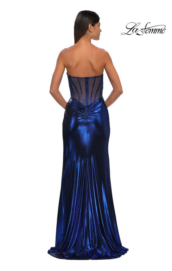 Exquisite metallic jersey dress with criss cross ruching on the bodice and waist. High skirt slit and sweetheart neckline. Back zipper closure.