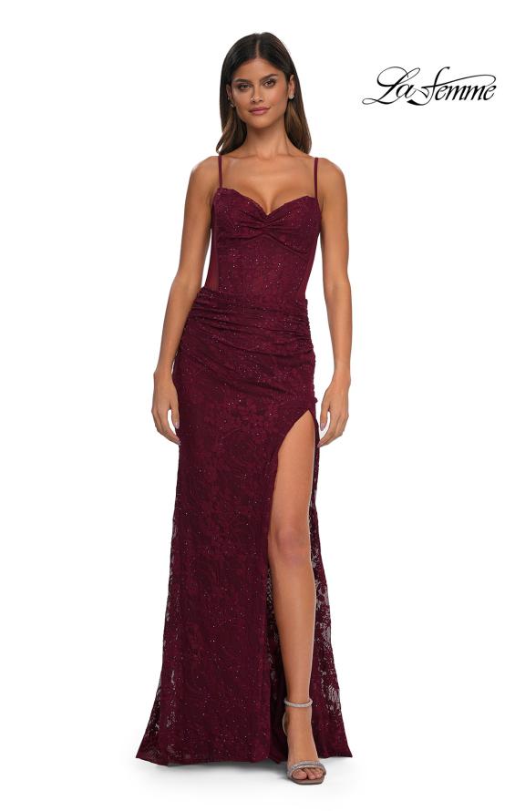 Sleek and alluring black stretch lace gown with a fitted silhouette. It features a delicate lace bodice with exposed boning details and subtle rhinestones throughout. The bodice is a V neck and has ruching in the center bust. Sheer illusion corset style back. Back zipper closure.