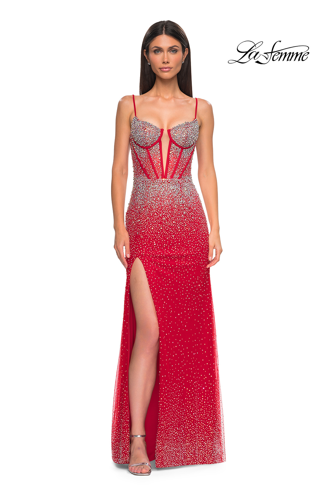 Gorgeous fitted prom dress fully embellished with rhinestones. The corset bodice is covered in rhinestones and has a deep V mesh neckline. Back zipper closure.