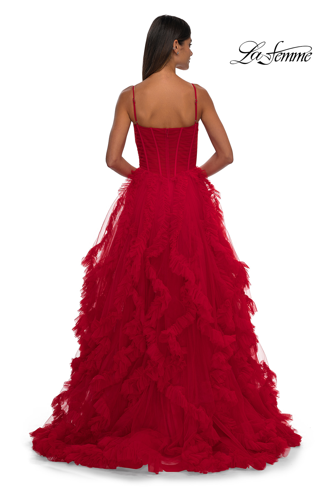 Unique ruffle tulle ballgown with a tiered design on the skirt. The corset bodice features exposed boning and intricate ruching between the waist panels. Back zipper closure.