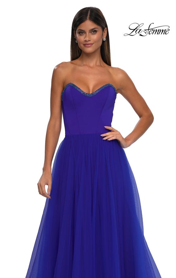 Chic A-line tulle prom dress with a full skirt, slit and pockets. The satin fitted bodice features a rhinestone detailed neckline and the back has adjustable lace up straps. Back zipper closure.
