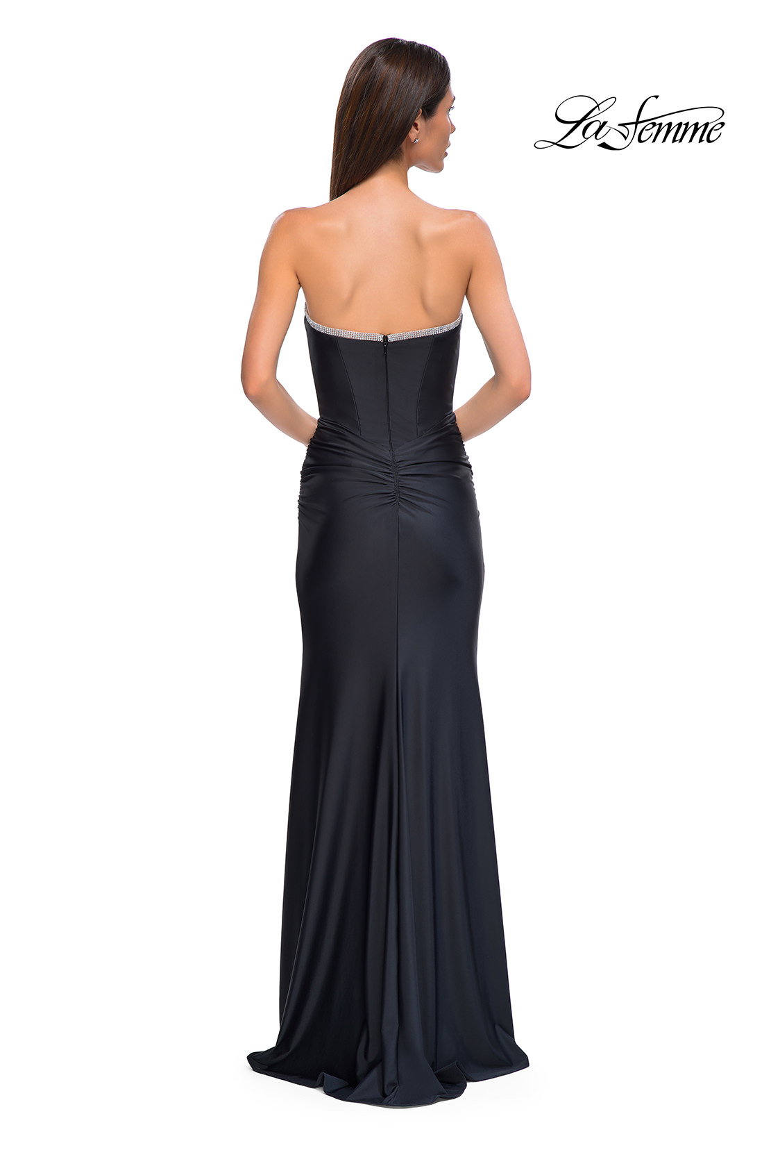 Chic jersey prom dress with a ruched skirt and slit. The sweetheart neckline features a rhinestones long the edge. Back zipper closure.
