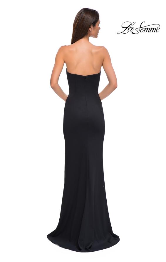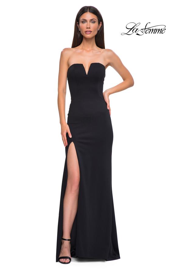 PREVIOUS STYLE NEXT STYLE LA FEMME 32784Size00 - 16 Size ChartColorBlackDeep red Share on FIND STORES NEAR MESimply chic strapless jersey prom dress with a slit and V neckline. Back zipper closure.