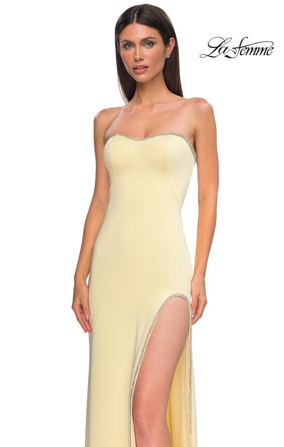 Strapless jersey dress with lace up open back. The gown features a jewel rhinestone edging along the neckline and high slit. Back zipper closure. Dress comes in aubergine, black, emerald, and white under style number 31977.