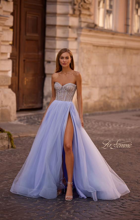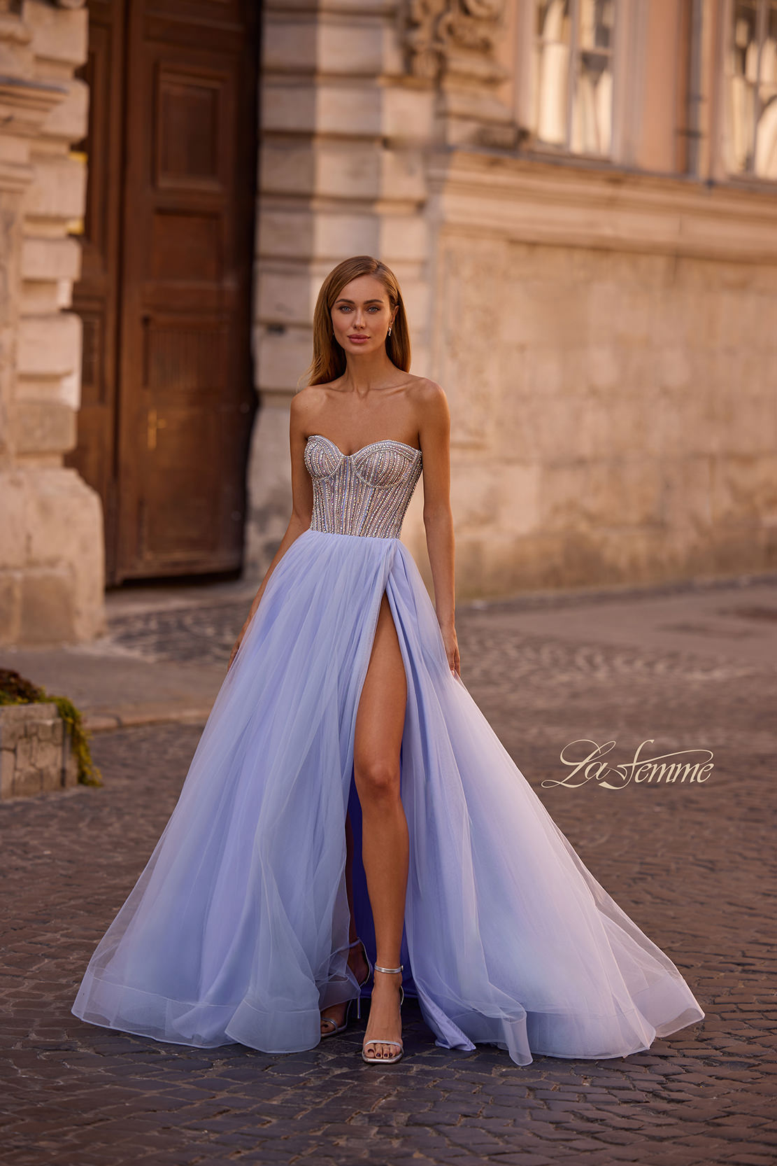 Stunning A-line tulle prom dress with a high slit and pockets. The strapless top has a beautiful rhinestone lined design with a variety of rhinestone sizes. Back zipper closure.