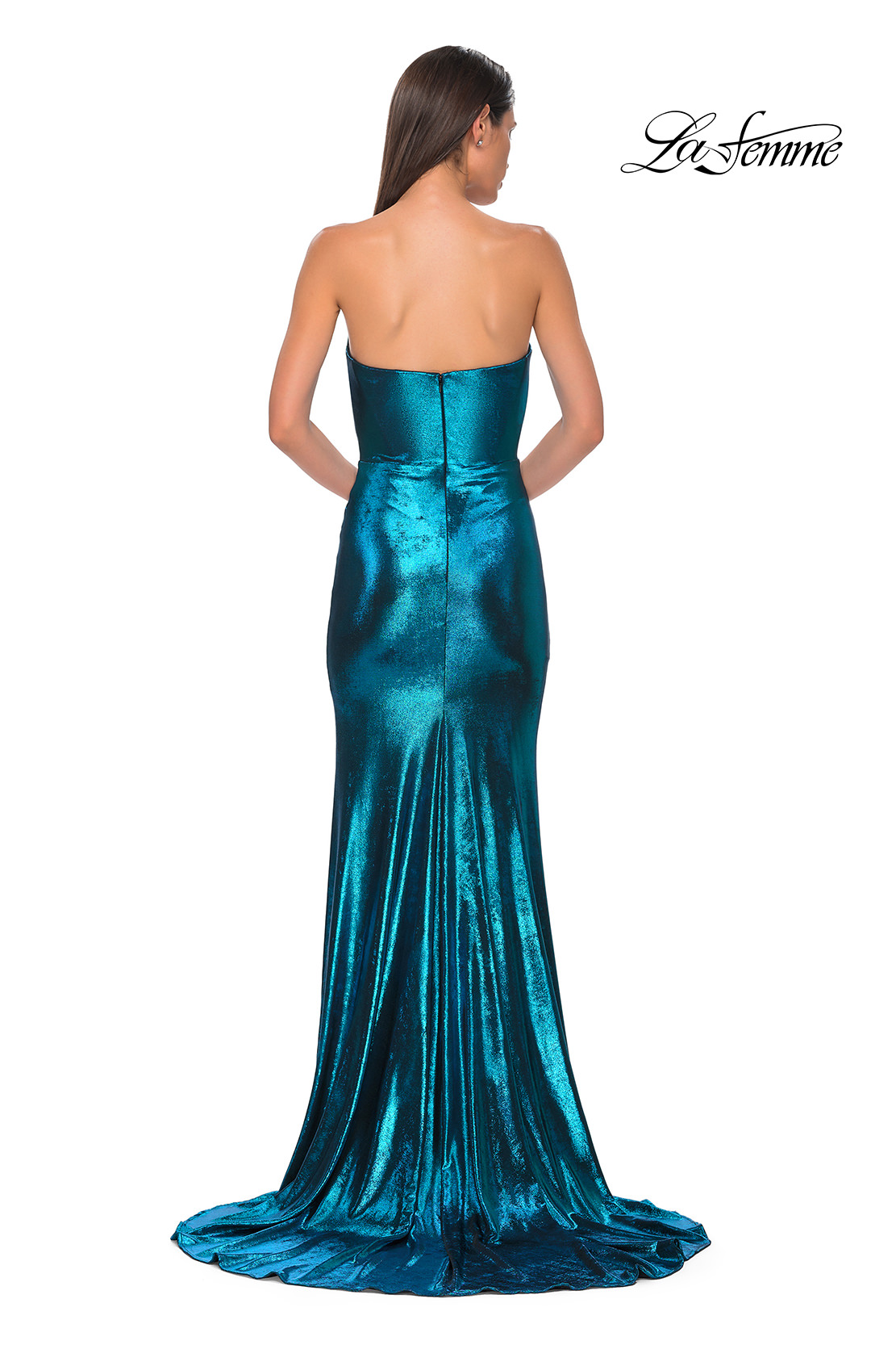 Fabulous and versatile strapless brushed metallic dress with a draped neckline and slit. Back zipper closure.