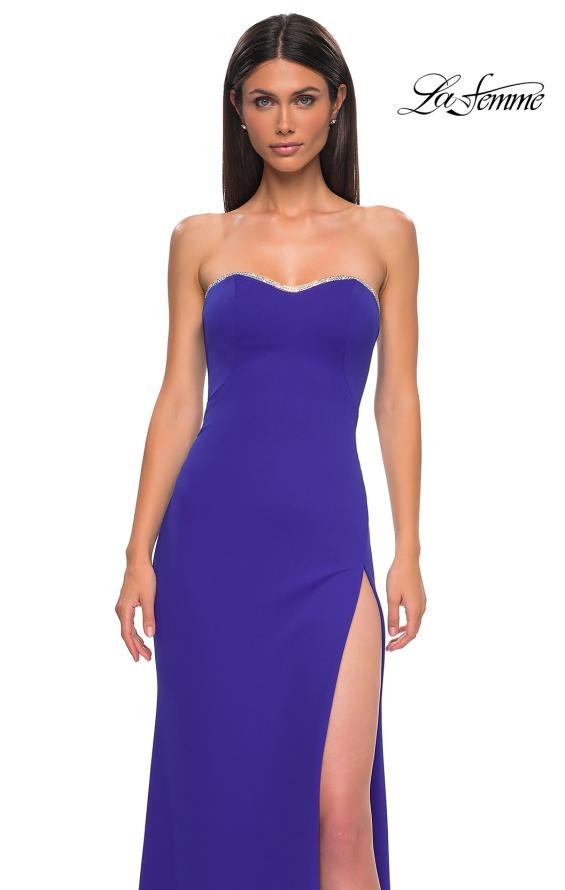 Chic strapless jersey dress with a high slit and adjustable lace up back. The neckline features a rhinestone edge. Back zipper closure.