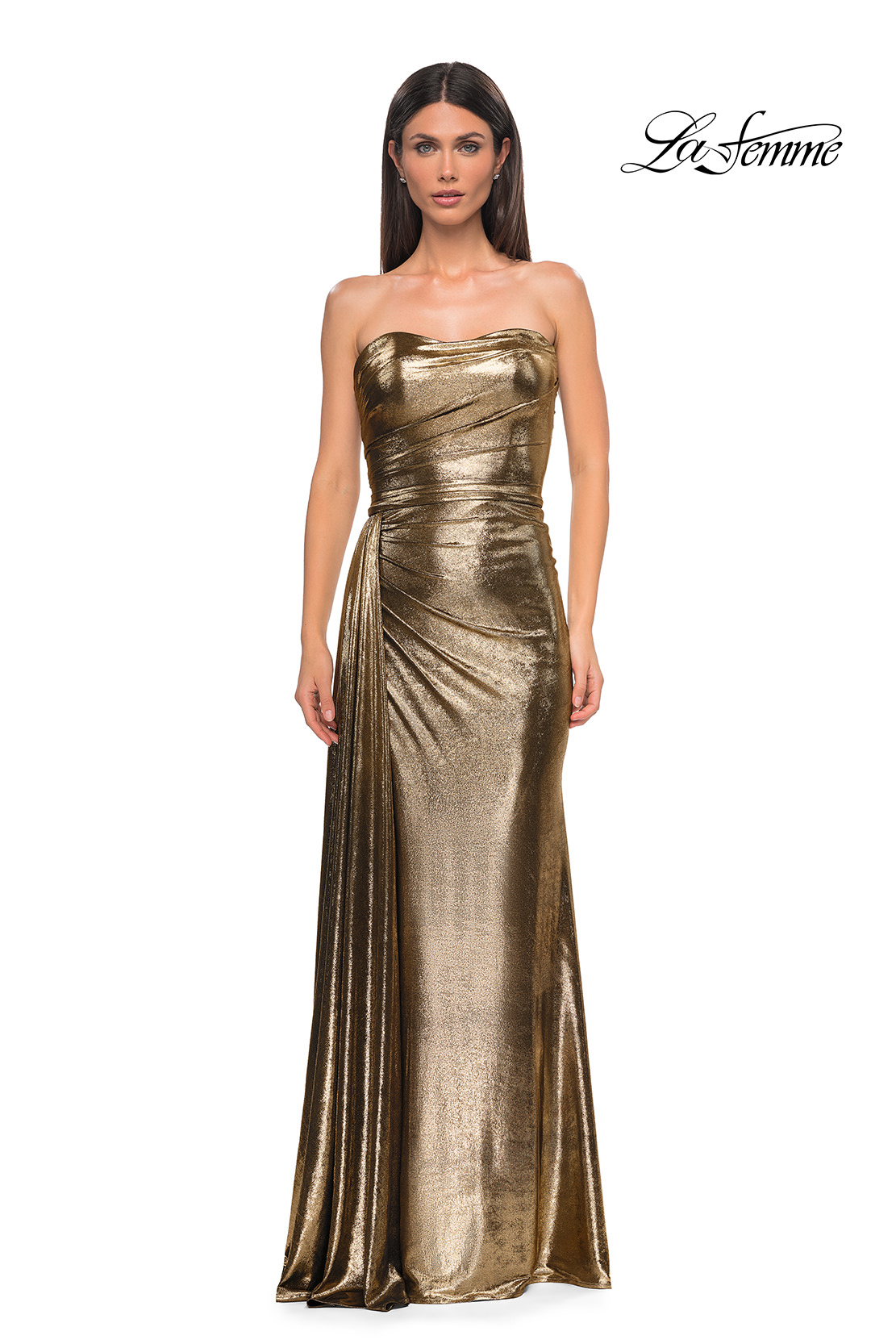 Elegant strapless evening gown with brushed metallic stretch jersey fabric. The dress features ruching and a draped slit design. Back zipper closure.