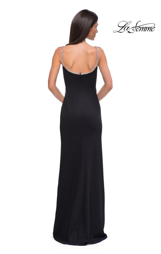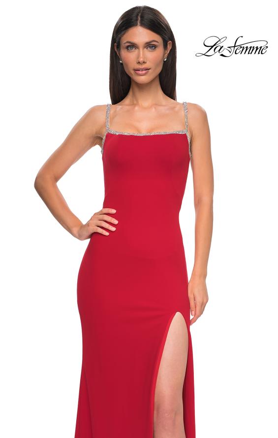 Elegant jersey evening dress with a modern design and high slit. The square neckline and straps features beautiful rhinestone edges. Back zipper closure.